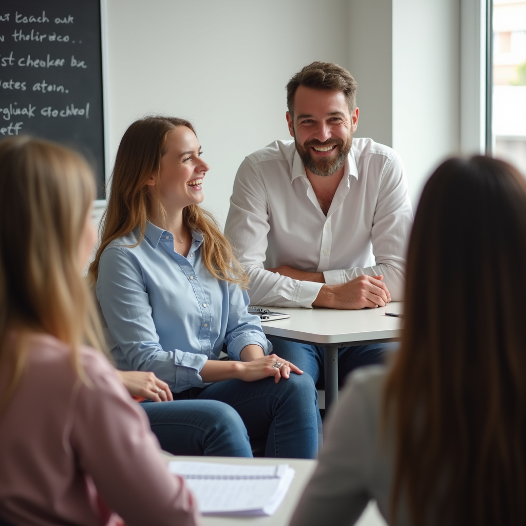 As aulas são interativas e podem ser presenciais ou online, com foco em conversação, gramática e vocabulário.
